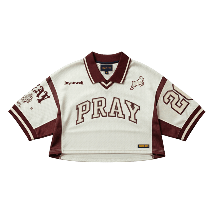 PRAY Cropped Jersey in cream mesh with Bordeaux contrast panels. Features bold varsity branding across the chest and sleeve, anchored by legacy number "26" on the back. Contoured streetwear fit with rib-knit polo collar designed for the modern woman. High-breathability construction pairs effortlessly with high-waisted denim or cargos. Pre-order now.